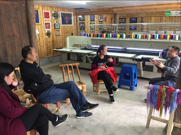 邓德猛副主任一行最后来到合兴村苗绣合作社,参观了合作社生产现场,了解合作社经营发展情况和16位受助贫困母亲去年十月项目实施以来的收益。合作社负责人麻妹英全面介绍:目前合作社绣娘遍布吉卫、补抽、雅酉三个乡镇十多个村寨,员工近200人,加工生产的产品有二十余种,在邻近城镇开设零售、批发门面3个,2017年纯利润达十余万元。为方便经营销售,2018年合作社计划拿出20万元项目资金在吉卫镇开设一个分厂,扩大生产规模。