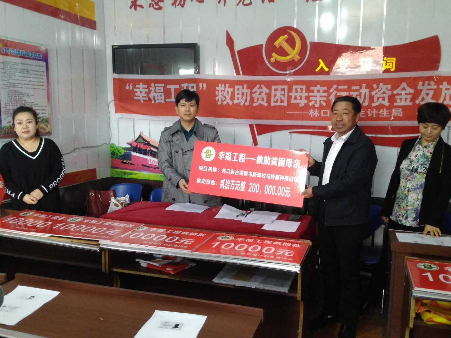 2018年5月7日,林口县“幸福工程——救助贫困母亲”资助款发放仪式在古城镇乌斯浑村举行,县卫生计生局副局长、计生协会副会长孙旭林、古城镇人大副主席曹金生等参加仪式。会上,县项目办为乌斯浑村项目点发放了救助资金,乌斯浑村的汪丽芬、刘济凤、于春莲等20位贫困母亲共获得20万元幸福工程项目资助款。
