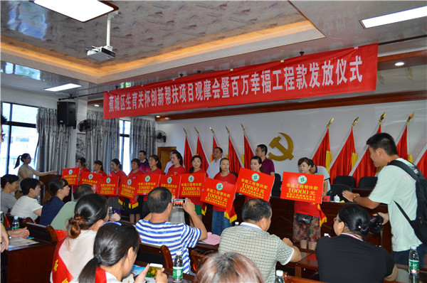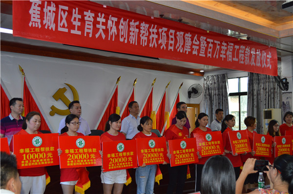 霍童镇获得一万元幸福工程款的9位受助母亲上台领款,并获赠免费体检和家庭医生团队签约服务