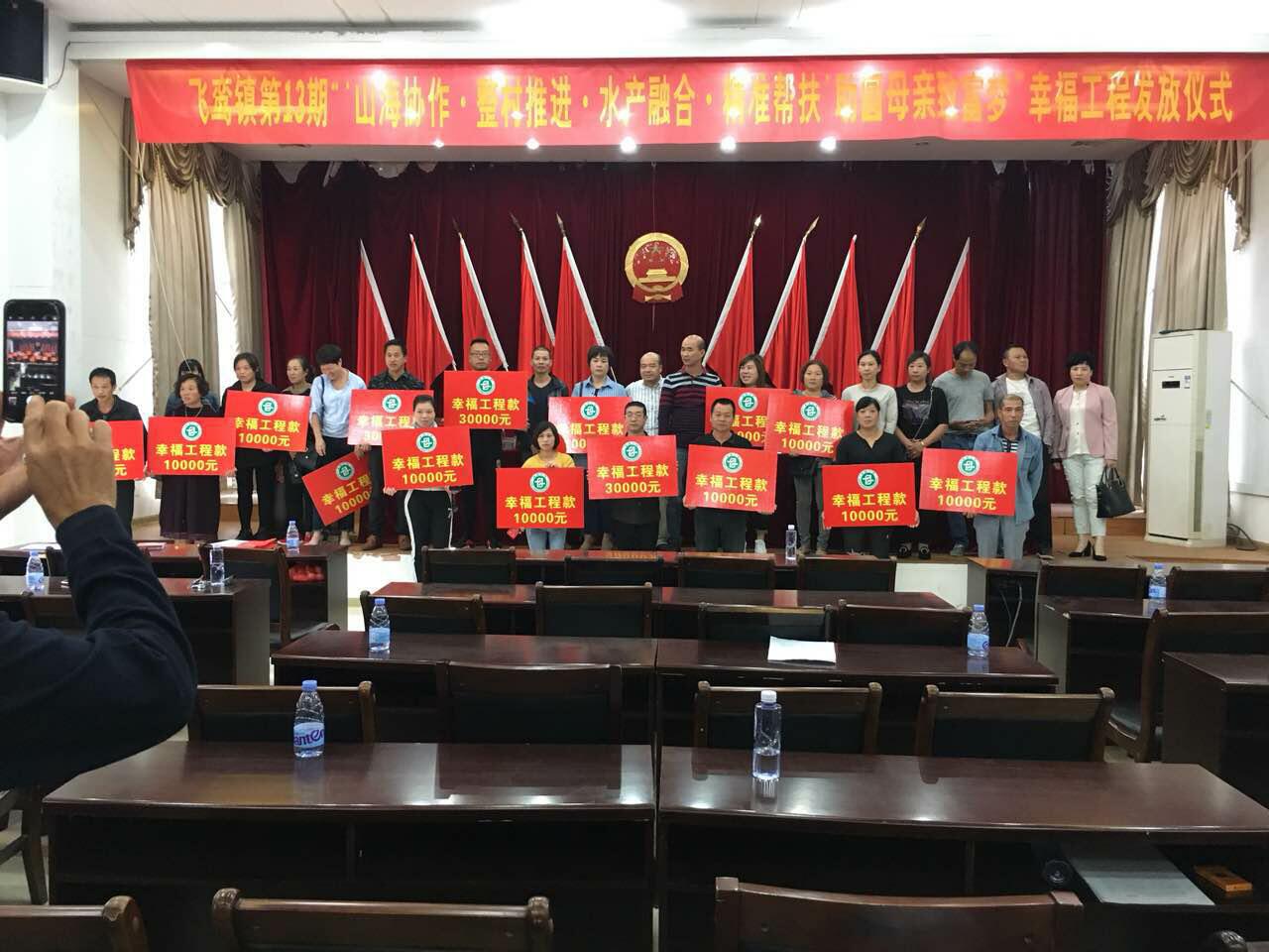 幸福工程精准帮扶项目飞鸾镇抓住小城镇综合改革建设契机,投入31万元幸福工程款,依托岳海水产食品有限公司水产品牌、销售、开发优势,以入股分红、务工收入两种方式吸纳8位计生贫困母亲在水产公司务工取酬和参股享分红;同时以自主创业为基础,结对帮扶7位计生贫困母亲发展水产养殖加工业。水产公司与受助母亲签订产、供、销合作协议,实行“三包二统一赊” 优惠政策,即包鱼苗供应、包技术指导、包保护价收购,统一品牌、统一销售、赊欠鱼苗款等帮扶措施,帮助受助户低价购买优质鱼苗、饲料,提供免费技术培训、指导及产品销售服务,公司保护价收购海产品,受助母亲不承担任何风险就可获得稳定收入,形成育、养、买、卖“一条龙”服务体系和统一规划、统一生产、统一销售的产业链;其次,建立凤凰山、白马山农业休闲观光旅游、优质农产品等基地,鼓励6位受助母亲采用承包种植方式进园创业,结合合作社优势产业,发展生态农业和观光农业,加速山地综合开发,加快富山富民步伐,实现利益共享,风险共担;并为4位参与黄鱼养殖的计生贫困户无偿提供生产成本,从育苗、物资、技术、信息等方面全面挂钩帮扶,帮助解决产前、产中、产后问题,所产生的效益全部归贫困户享有,做到“真心”联系群众,“贴心”为民解困。