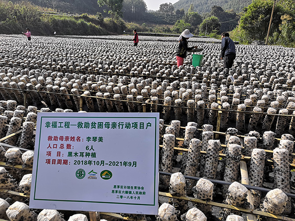 2018年10月,在中国人口福利基金会、幸福工程全国组委会、省计划生育协会的关心和支持下,我市在思茅区六顺镇启动实施幸福工程——救助贫困母亲行动项目,成立了由分管副区长任组长的幸福工程组委会,负责幸福工程项目的运转、协调和监督,共帮助23位贫困母亲种植黑木耳,采用“协会+企业+农户”的模式,农户种植,村委专人监管,东宝公司提供技术指导并负责收购的经营模式,从而让受助贫困母亲得到真正的实惠,实现脱贫致富的目的。