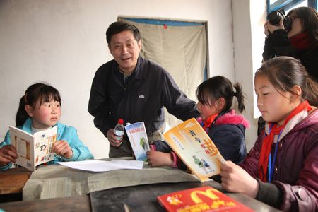 骆驼山沟小学带领24个学生的张老师在高兴地翻阅送到的书籍