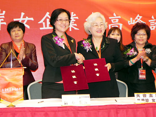 我会副理事长、幸福工程组委会副主任 、全国工商联女商会会长、联亚集团总裁刘亭女士,近日率女商会代表团访台并出席第一届两岸女企业家高峰论坛。 1 月 6 日,刘亭拜会中国国民党荣誉主席连战时,将山东即墨市贫困母亲手工绣制的工艺品“即墨花边”赠与连战夫妇。连战夫妇对精致的“即墨花边”给予很好评价,并对“绣娘”们的辛苦劳动表示钦佩。