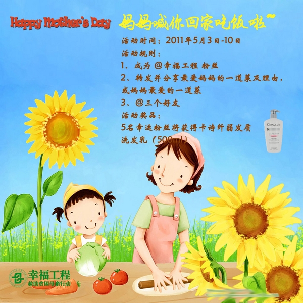 5 月 3 — 9 日,“幸福工程”和欧莱雅(中国)在官方微博上发起“妈妈喊你回家吃饭啦”网友互动活动。号召大家分享自己最爱吃的一道妈妈做的菜,和妈妈最爱吃的一道菜,以此提醒大家多多了解、关心自己的母亲,并送上母亲节的祝福。活动链接地址: http://t.sina.com.cn/xfgc