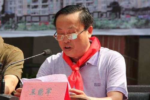 现场的留守儿童代表为主席台领导佩戴红领巾。