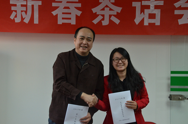 葛振江副秘书长宣读《关于表彰2014年度优秀共产党员、优秀员工及先进社会工作者的决定》,赵本志、牛艳平、刘丽容、李士强、李晓琳、宋宏云分别荣获“优秀共产党员”、“优秀员工”和“先进社会工作者”荣誉称号。吴小兵、杨辰、佟凤获得年度单项奖。赵炳礼理事长、张晖秘书长向先优个人和单项奖获得者颁发证书。俞华副秘书长就人基会新的工资制度、员工职级确定以及2015年部门绩效指标等事项进行了说明。随后,张晖秘书长与各部门部长签订《2015年度党风廉政建设责任书》和《2015年度部门目标责任书》。员工们围绕2014年的工作、学习、生活等内容座谈发言,分享感受。会议简单而热烈,处处充满温情感动。