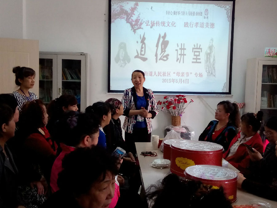 适逢母亲节来临之际,通东街道人民社区举办了主题为“弘扬传统文化,践行孝道美德”道德讲堂活动暨母亲节特别活动。社区里近40余名贫困残疾母亲参加了此次活动。人民社区将本场 “道德讲堂”的重点定位为“孝亲敬老”。整场活动分为唱歌曲、学模范、谈感悟、诵经典、习礼仪、送吉祥共六个环节。学模范环节,由社区最美家庭代表——李文英、张玉杰两位大姐讲述了她们孝老、爱亲的感人事迹。听了两位好人孝亲敬老的模范事迹后,在场居民纷纷发表自己的感悟,表示要向身边的道德模范学习,以实际行动践行“孝亲敬老”中华民族传统美德,并结合“母亲节”纪念日,讲述了自身如何营造幸福家庭和谐氛围,与在场居民一同分享了家庭成员之间的感同身受。唱歌曲环节,大家共同合唱《母亲》把气氛推上高潮。送吉祥环节,社区精心准备了鲜花和母亲节贺卡作为母亲节礼物,送给了现场的每位居民,传递了吉祥和祝福。最后为将要过生日的残疾人母亲果丽茹过生日。