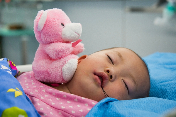 母亲看到刚完成手术的孩子
