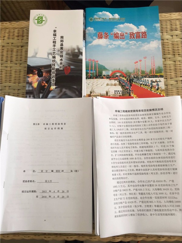 该项目于2015年4月正式启动,项目周期三年,人口基金会资助50万,地方配套50万,以“合作社+贫困母亲的”方式,帮助水井、桂花、朝阳、五丰、庄子等5个自然村的100位贫困母亲参与藤编制品加工项目,合作社为贫困母亲统一提供技术培训,统一供应原材料,并以高于普通产品加工者10%的价格统一回收销售产品。截至目前,项目运行两年,72位在家中自主生产的受助母亲,边做家务边从事藤编,人均增收16920元,由合作社集中安置的28位受助母亲,人均增收27340元。这一项目受到了贫困母亲的欢迎,许多没有得到帮扶的母亲也纷纷找到乡政府或合作社,希望能够得到幸福工程项目的资助。